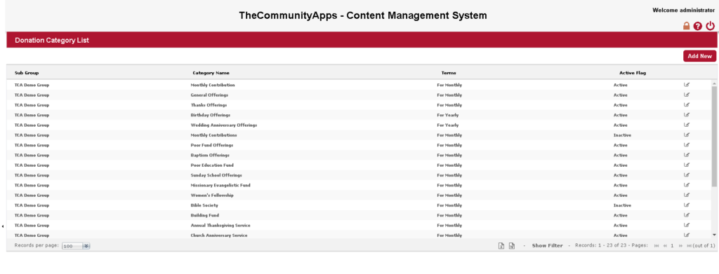 In the Donation Category List page to add a new Donation Category click on the Add New in the top right corner.
