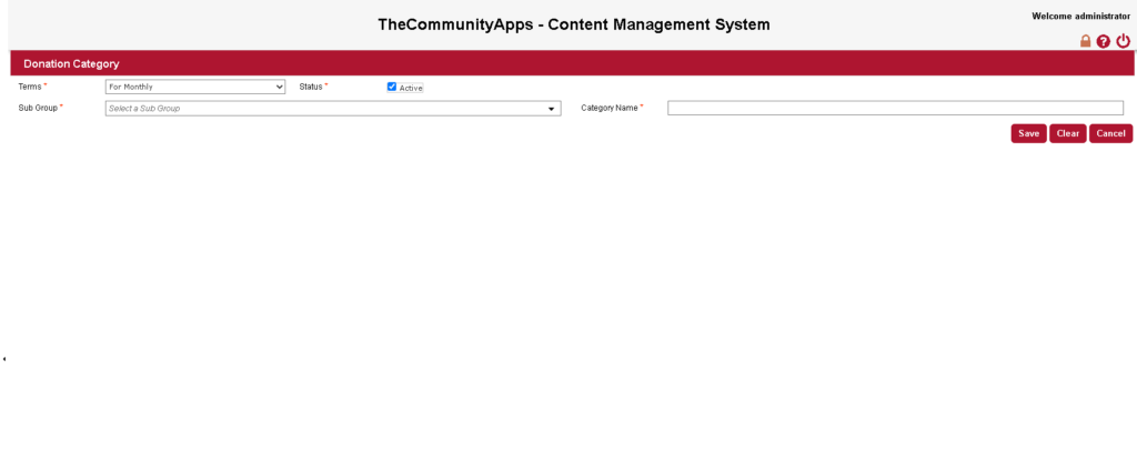 In the page for Donation Category select the TermsĀ * (Monthly, Yearly or One time ) the category applies to and enter the Category NameĀ * and after that click save.